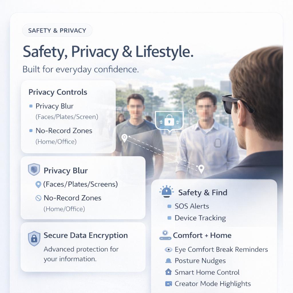 Privacy and safety features help you feel confident wearing smart glasses in public and at home.