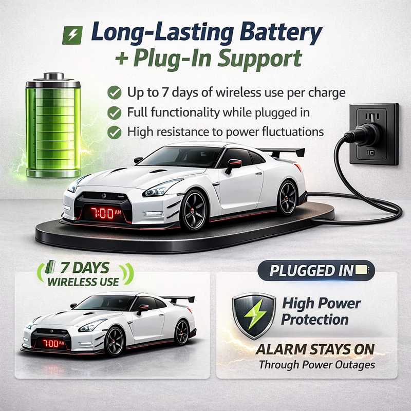 • Smart Hypercar Alarm Clock with built-in lithium rechargeable battery